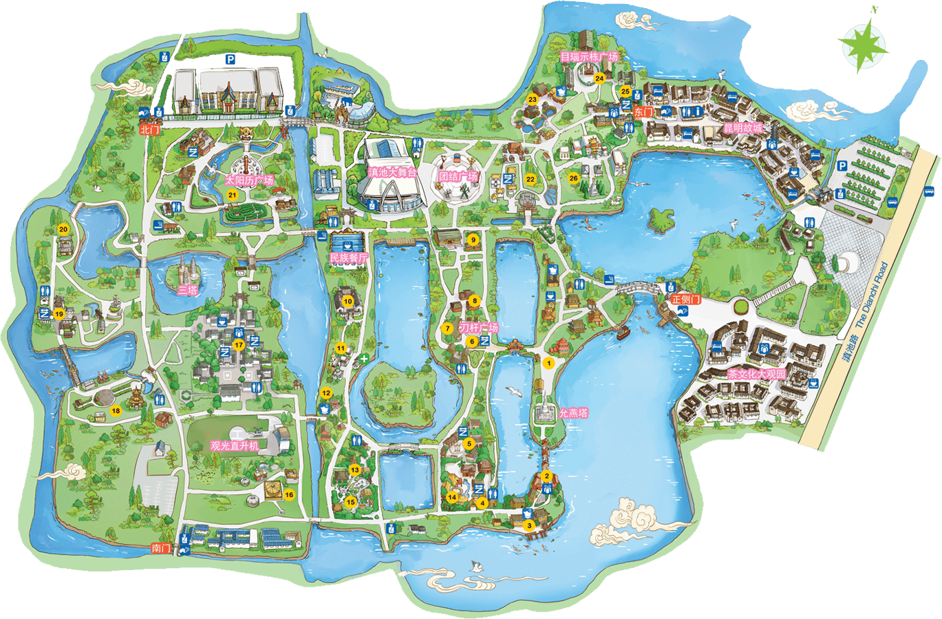 傣族人口約107萬(wàn)人,主要分布在云南的德宏傣族景頗族自治州、西雙版納傣族自治州及瀾滄江流域的河谷壩子區(qū)域。傣族寨是進(jìn)入民族村的第一個(gè)村寨,占地面積27畝,三面環(huán)水,綠樹(shù)掩映。一幢幢“干欄式”傣家竹樓,通過(guò)蜿延的紅砂石小徑聯(lián)向肅穆的緬寺。巍峨壯觀的白塔,精巧玲瓏的風(fēng)雨橋,以及風(fēng)雨亭、水井、鐘亭等建筑充滿著傣家的濃郁風(fēng)情,是傣寨真實(shí)的民間景觀再現(xiàn)。一年一度的“潑水節(jié)”期間,這里都有活潑歡快的“象腳鼓舞...